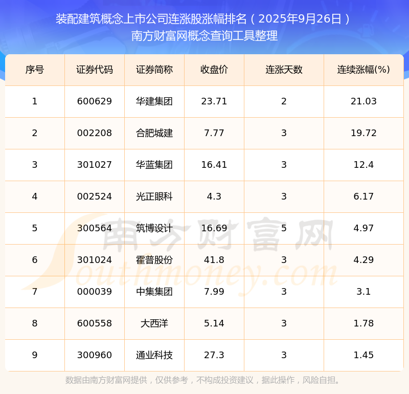 2025年9月26日裝配建筑概念上市公司連漲股漲幅排名