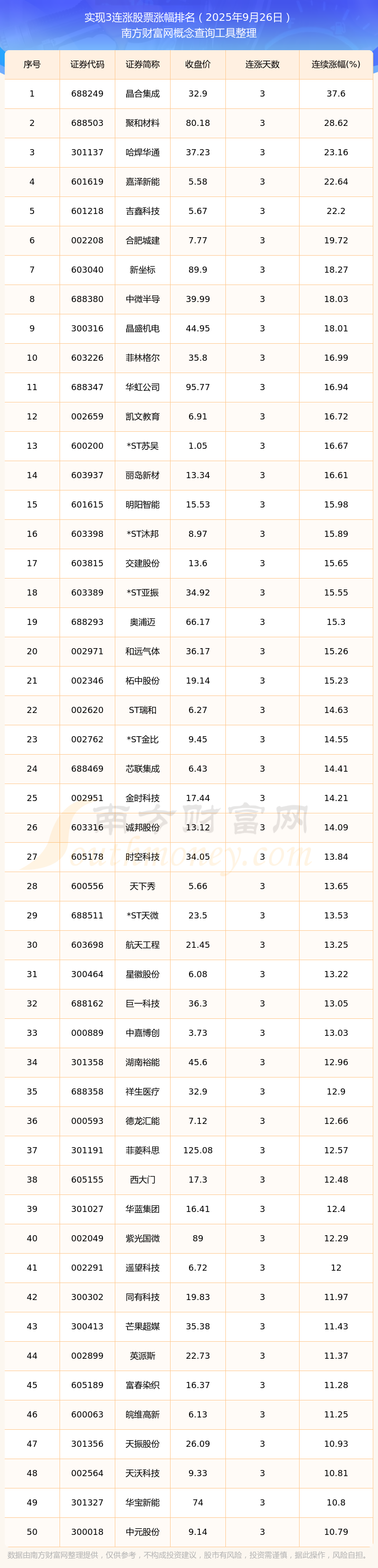 2025年9月26日實現3連漲股票漲幅排名