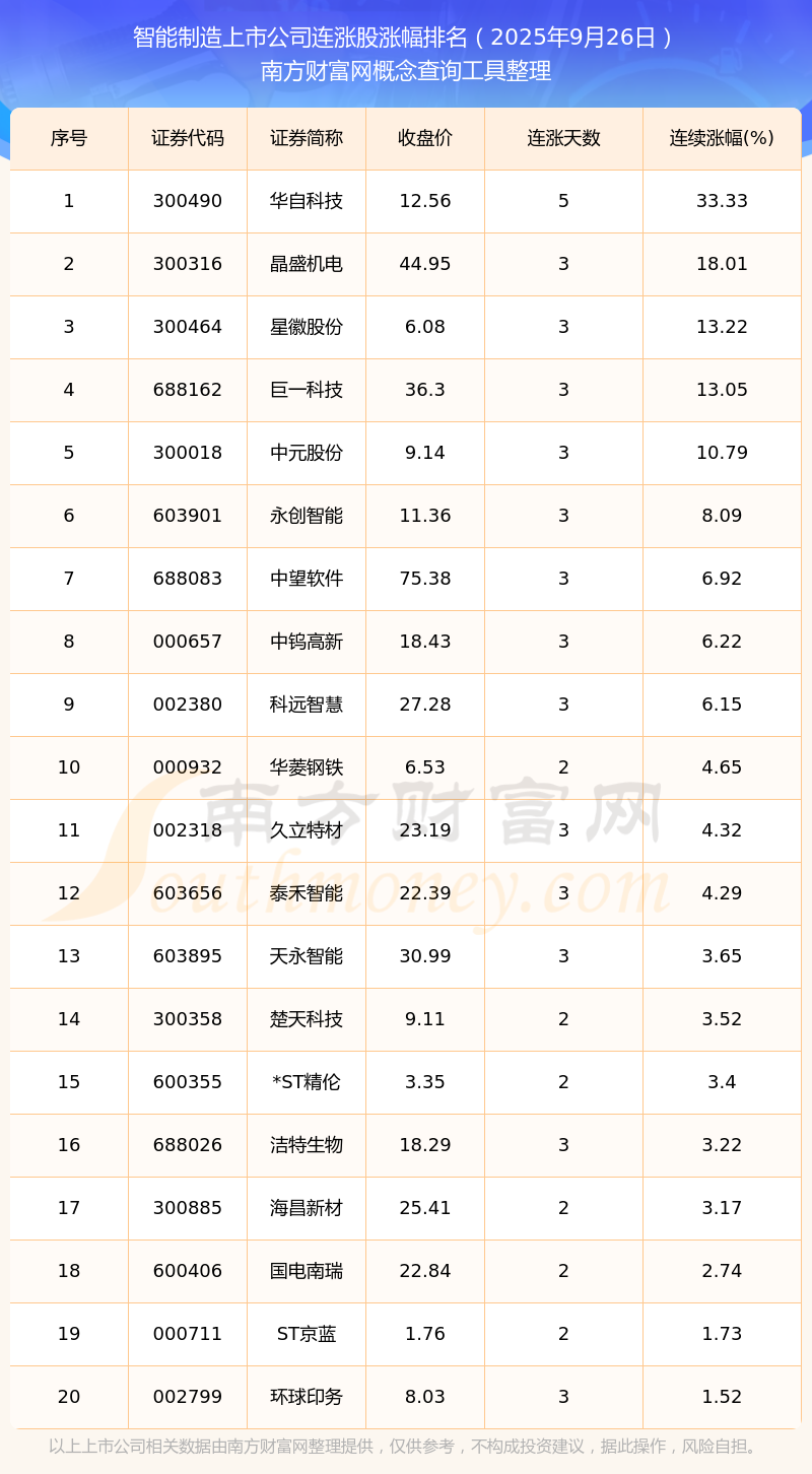 2025年9月26日智能制造上市公司連漲股漲幅排名