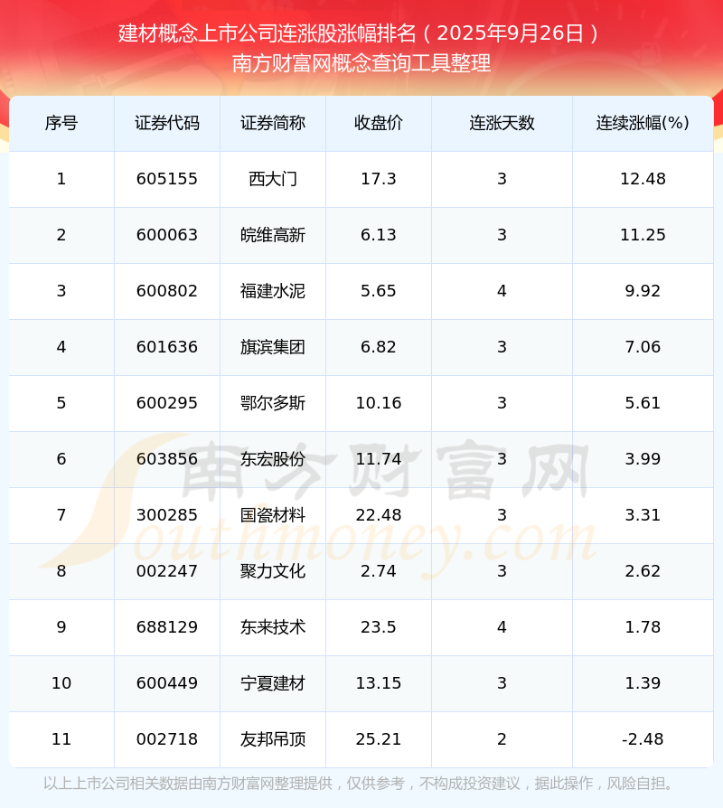 根據(jù)南方財富網(wǎng)概念查詢工具數(shù)據(jù)統(tǒng)計,截止2025年9月26日收盤,建材概念上市公司共有11只個股實現(xiàn)連漲。其中連續(xù)漲幅較大的個股有西大門、皖維高新、福建水泥等,連續(xù)漲幅分別為12.48%、11.25%、9.92%。