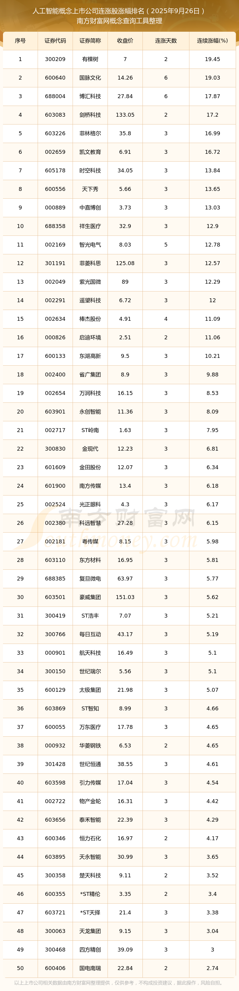 2025年9月26日人工智能概念上市公司連漲股漲幅排名