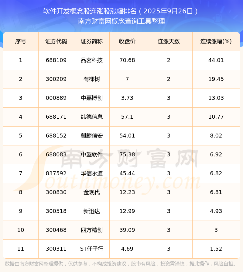 根據南方財富網概念查詢工具數據統(tǒng)計,截止2025年9月26日收盤,軟件開發(fā)概念股共有11只個股實現連漲。其中連續(xù)漲幅較大的個股有品茗科技、有棵樹、中嘉博創(chuàng)等,連續(xù)漲幅分別為44.01%、19.45%、13.03%。