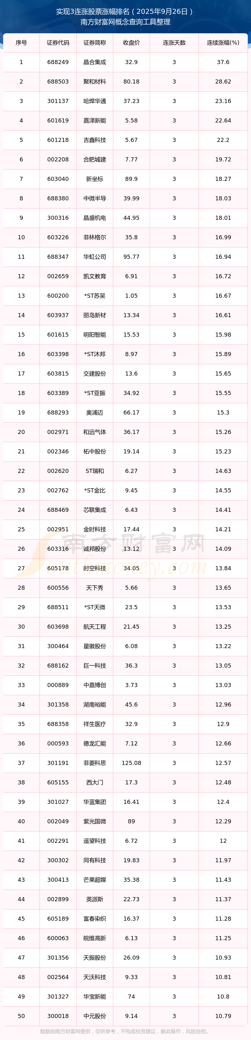 根據(jù)南方財(cái)富網(wǎng)概念查詢工具數(shù)據(jù)統(tǒng)計(jì),截止2025年9月26日收盤,共有253只個(gè)股實(shí)現(xiàn)3天連漲。其中連續(xù)漲幅較大的個(gè)股有晶合集成、聚和材料、哈焊華通等,連續(xù)漲幅分別為37.60%、28.62%、23.16%。
