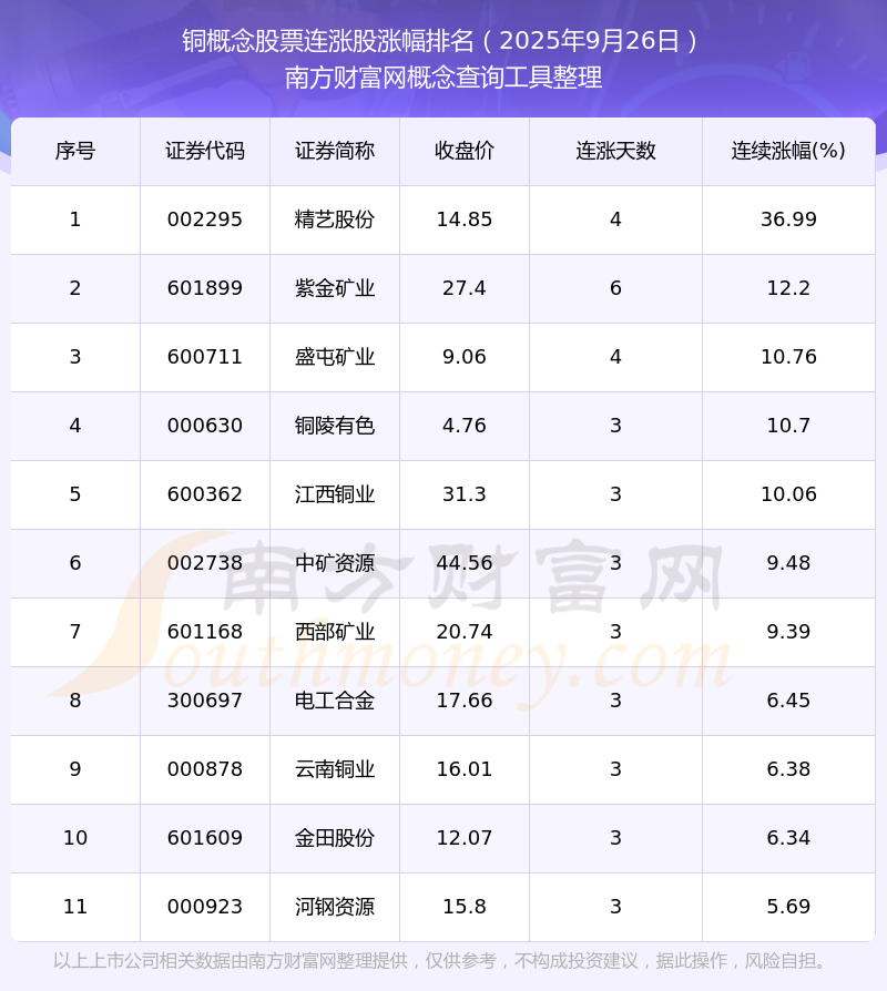 根據南方財富網概念查詢工具數據統(tǒng)計,截止2025年9月26日收盤,銅概念股票共有11只個股實現連漲。其中連續(xù)漲幅較大的個股有精藝股份、紫金礦業(yè)、盛屯礦業(yè)等,連續(xù)漲幅分別為36.99%、12.20%、10.76%。
