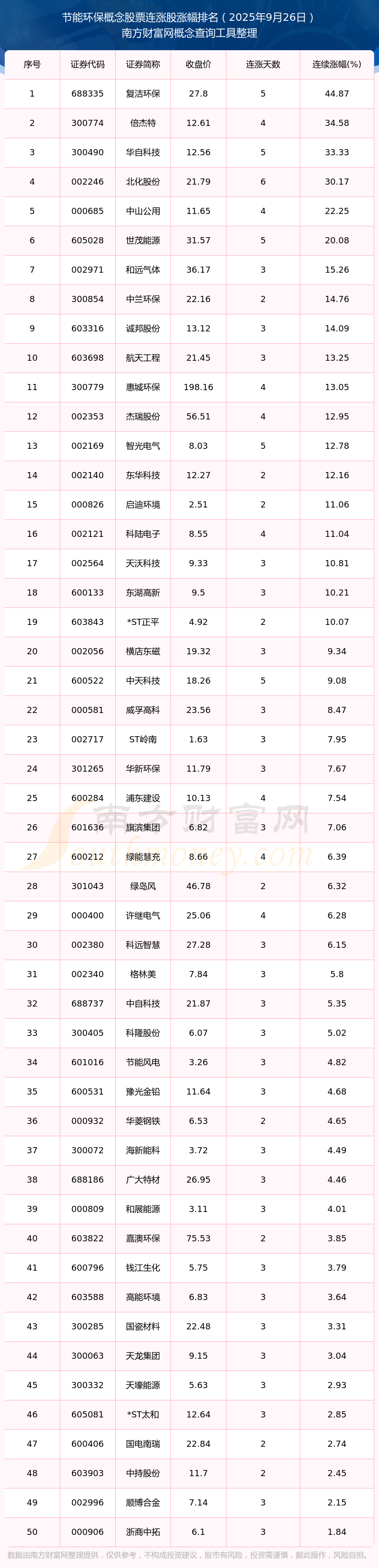 2025年9月26日節(jié)能環(huán)保概念股票連漲股漲幅排名