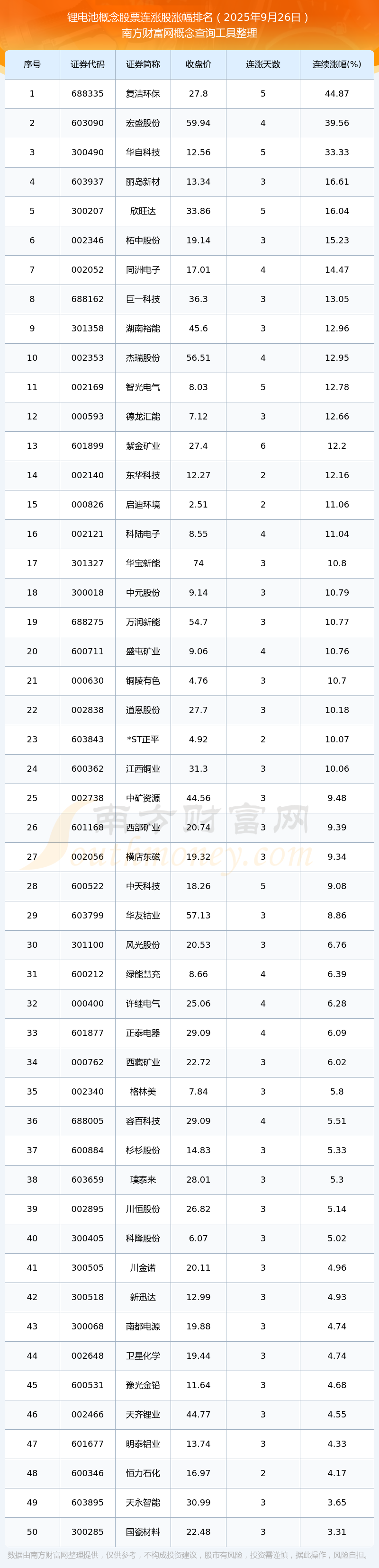 2025年9月26日鋰電池概念股票連漲股漲幅排名