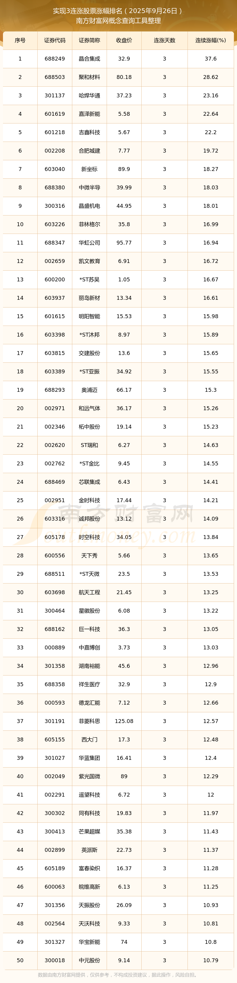 根據(jù)南方財富網(wǎng)概念查詢工具數(shù)據(jù)統(tǒng)計,截止2025年9月26日收盤,共有253只個股實現(xiàn)3天連漲。其中連續(xù)漲幅較大的個股有晶合集成、聚和材料、哈焊華通等,連續(xù)漲幅分別為37.60%、28.62%、23.16%。