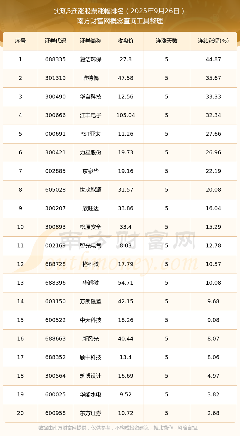 根據(jù)南方財富網概念查詢工具數(shù)據(jù)統(tǒng)計,截止2025年9月26日收盤,共有20只個股實現(xiàn)5天連漲。其中連續(xù)漲幅較大的個股有復潔環(huán)保、唯特偶、華自科技等,連續(xù)漲幅分別為44.87%、35.67%、33.33%。