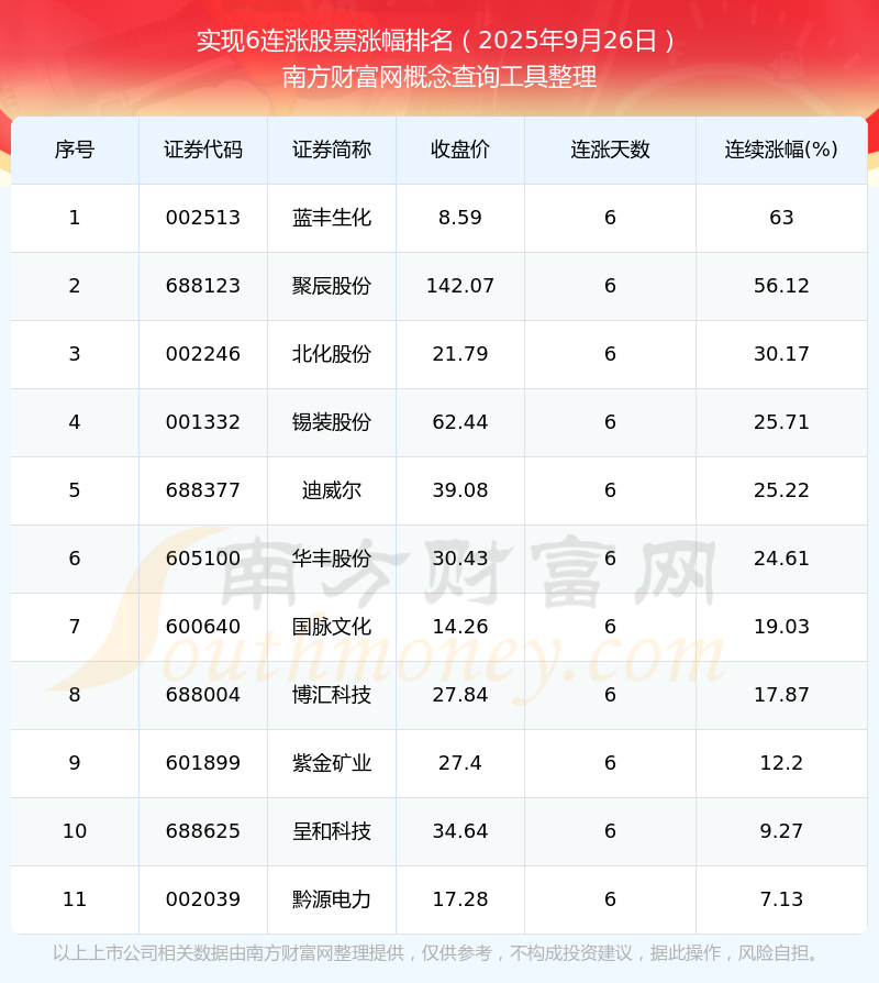 2025年9月26日實(shí)現(xiàn)6連漲股票漲幅排名