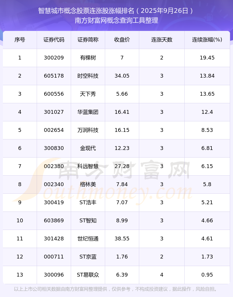 2025年9月26日智慧城市概念股票連漲股漲幅排名