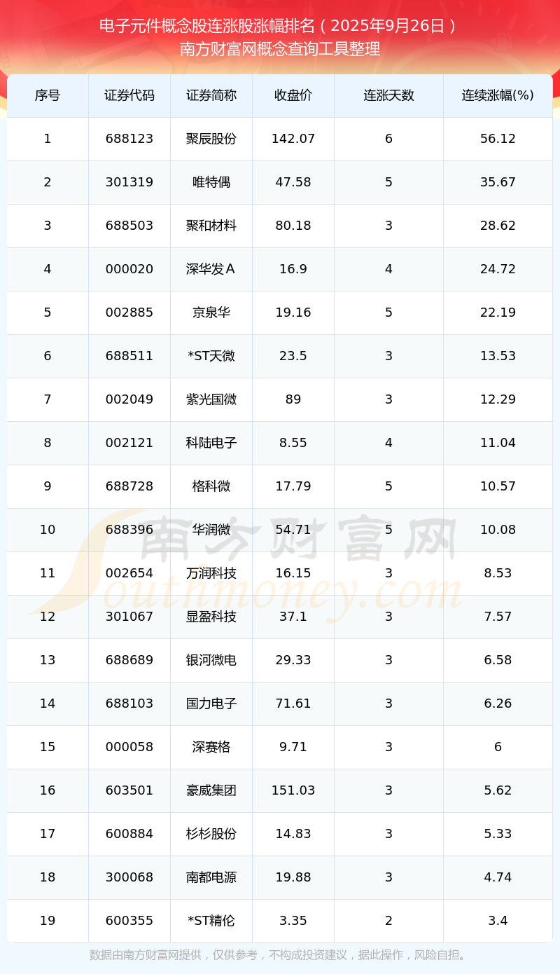 2025年9月26日電子元件概念股連漲股漲幅排名