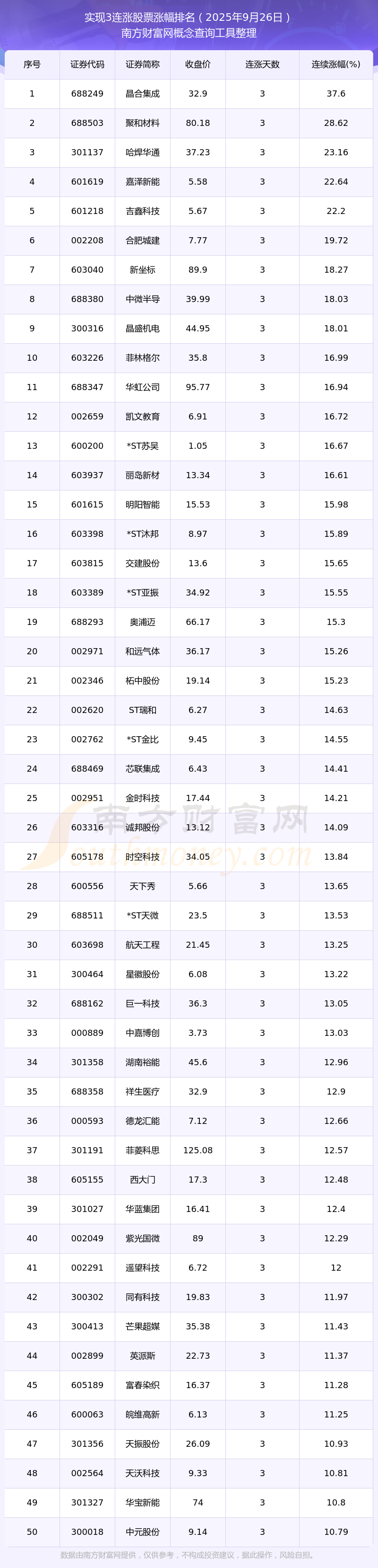 2025年9月26日實現(xiàn)3連漲股票漲幅排名