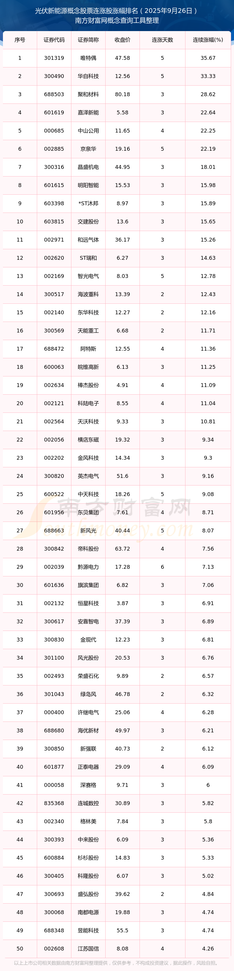 根據(jù)南方財(cái)富網(wǎng)概念查詢工具數(shù)據(jù)統(tǒng)計(jì),截止2025年9月26日收盤,光伏新能源概念股票共有61只個(gè)股實(shí)現(xiàn)連漲。其中連續(xù)漲幅較大的個(gè)股有唯特偶、華自科技、聚和材料等,連續(xù)漲幅分別為35.67%、33.33%、28.62%。