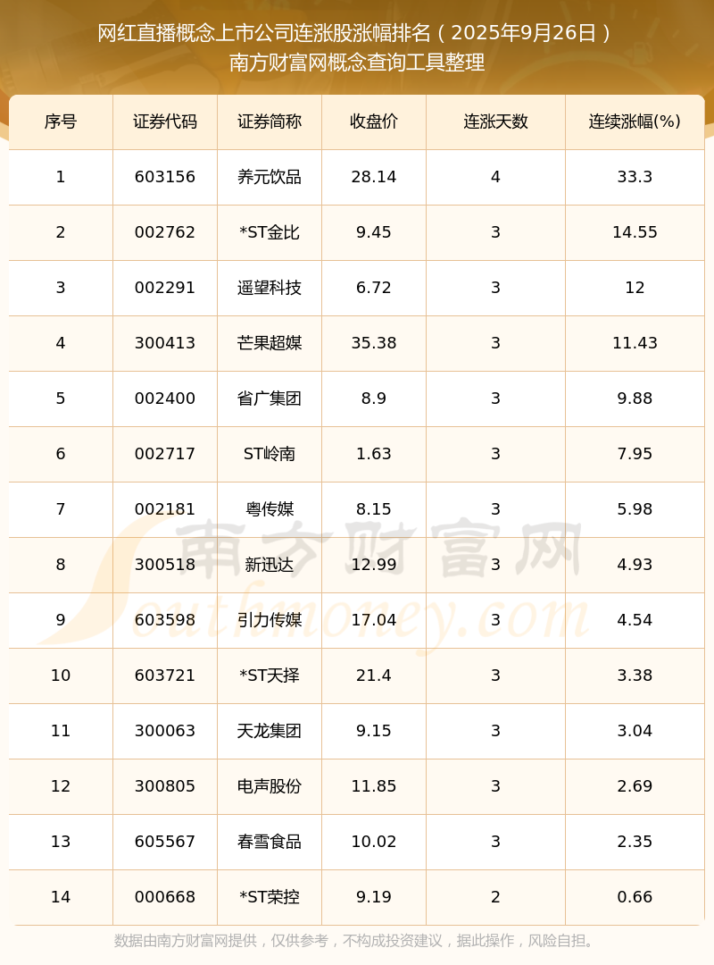 2025年9月26日網(wǎng)紅直播概念上市公司連漲股漲幅排名