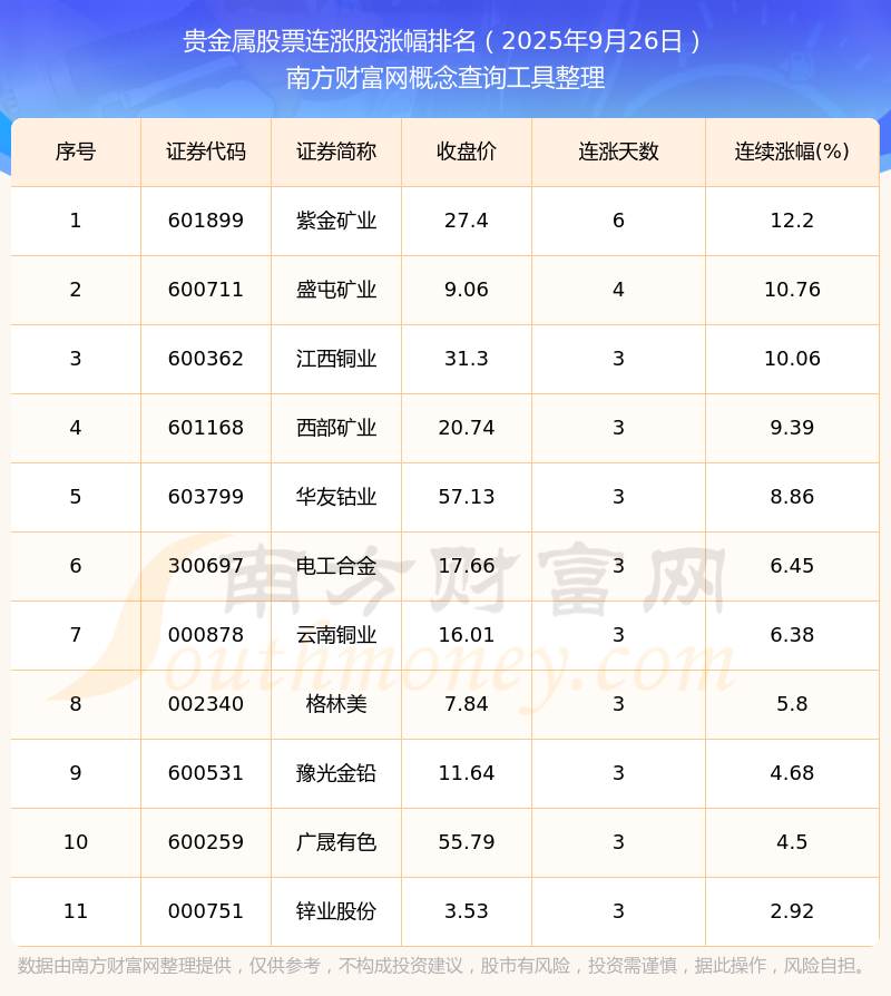 根據(jù)南方財(cái)富網(wǎng)概念查詢工具數(shù)據(jù)統(tǒng)計(jì),截止2025年9月26日收盤,貴金屬股票共有11只個(gè)股實(shí)現(xiàn)連漲。其中連續(xù)漲幅較大的個(gè)股有紫金礦業(yè)、盛屯礦業(yè)、江西銅業(yè)等,連續(xù)漲幅分別為12.20%、10.76%、10.06%。