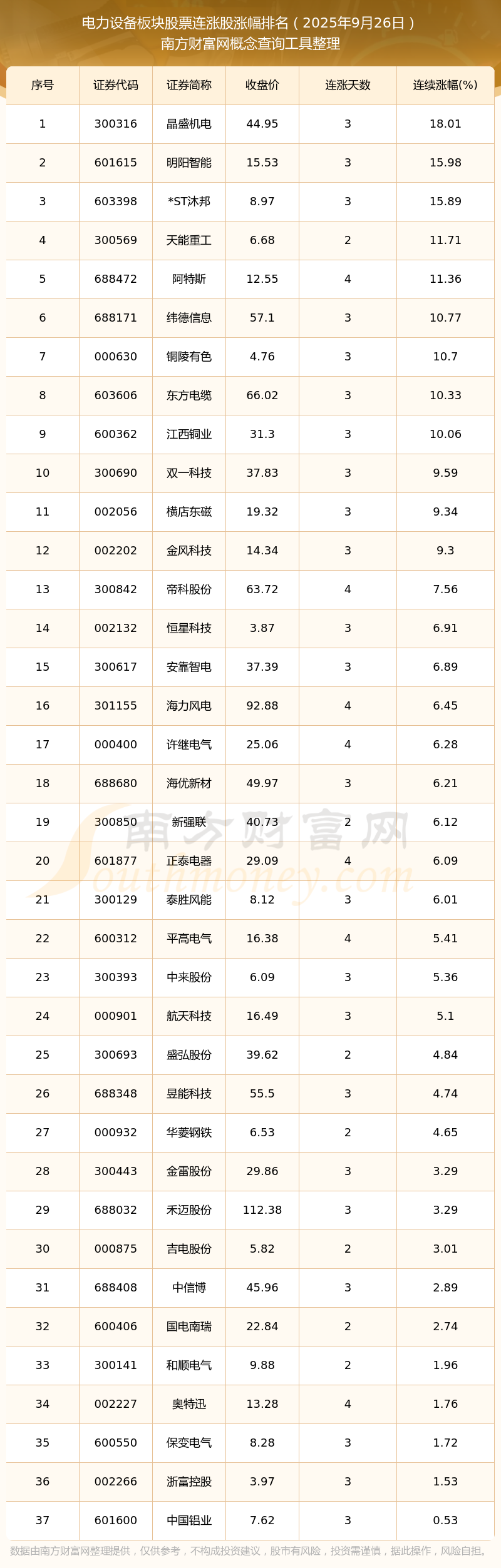 根據(jù)南方財(cái)富網(wǎng)概念查詢工具數(shù)據(jù)統(tǒng)計(jì),截止2025年9月26日收盤(pán),電力設(shè)備板塊股票共有37只個(gè)股實(shí)現(xiàn)連漲。其中連續(xù)漲幅較大的個(gè)股有晶盛機(jī)電、明陽(yáng)智能、*ST沐邦等,連續(xù)漲幅分別為18.01%、15.98%、15.89%。