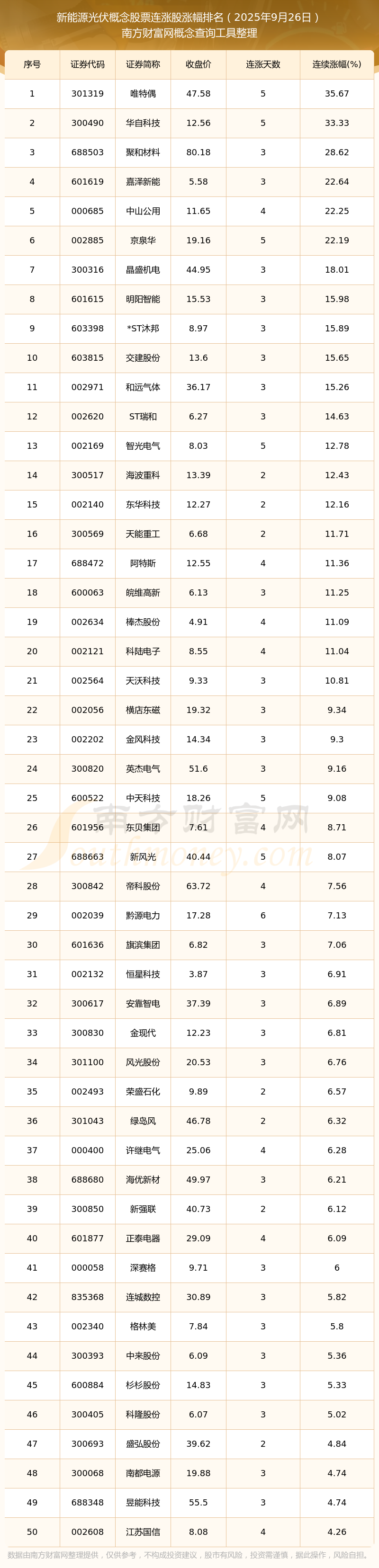 根據(jù)南方財(cái)富網(wǎng)概念查詢工具數(shù)據(jù)統(tǒng)計(jì),截止2025年9月26日收盤,新能源光伏概念股票共有61只個(gè)股實(shí)現(xiàn)連漲。其中連續(xù)漲幅較大的個(gè)股有唯特偶、華自科技、聚和材料等,連續(xù)漲幅分別為35.67%、33.33%、28.62%。