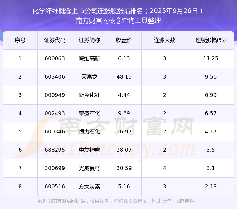 根據(jù)南方財(cái)富網(wǎng)概念查詢工具數(shù)據(jù)統(tǒng)計(jì),截止2025年9月26日收盤(pán),化學(xué)纖維概念上市公司共有8只個(gè)股實(shí)現(xiàn)連漲。其中連續(xù)漲幅較大的個(gè)股有皖維高新、天富龍、新鄉(xiāng)化纖等,連續(xù)漲幅分別為11.25%、9.56%、6.99%。