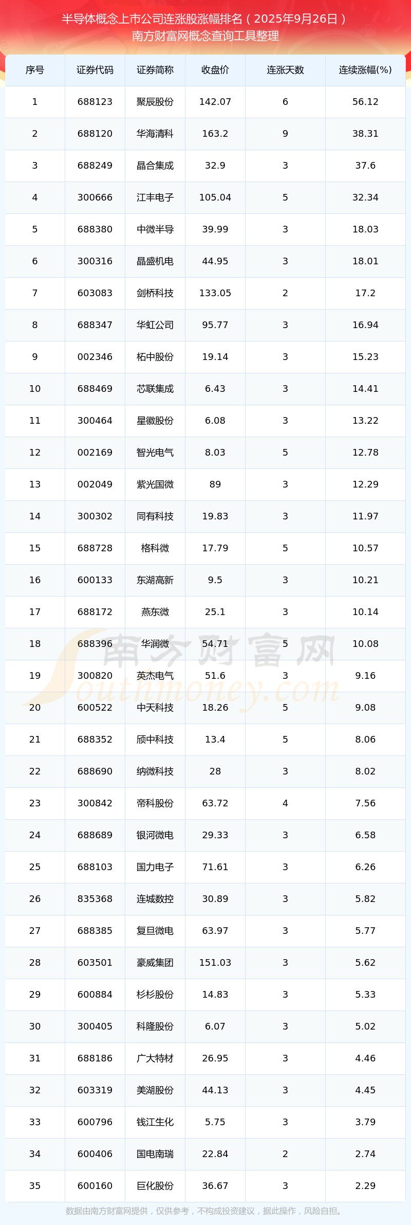 2025年9月26日半導(dǎo)體概念上市公司連漲股漲幅排名