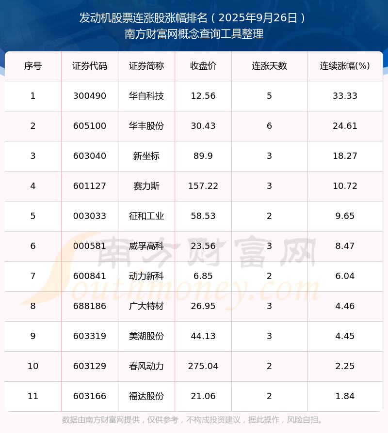2025年9月26日發(fā)動(dòng)機(jī)股票連漲股漲幅排名