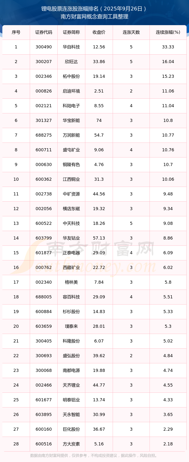 根據(jù)南方財(cái)富網(wǎng)概念查詢工具數(shù)據(jù)統(tǒng)計(jì),截止2025年9月26日收盤(pán),鋰電股票共有28只個(gè)股實(shí)現(xiàn)連漲。其中連續(xù)漲幅較大的個(gè)股有華自科技、欣旺達(dá)、柘中股份等,連續(xù)漲幅分別為33.33%、16.04%、15.23%。