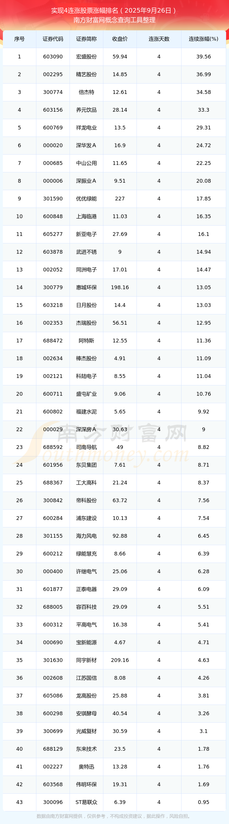 【今日股市行情】2025年9月26日43只股票實現(xiàn)4連漲!