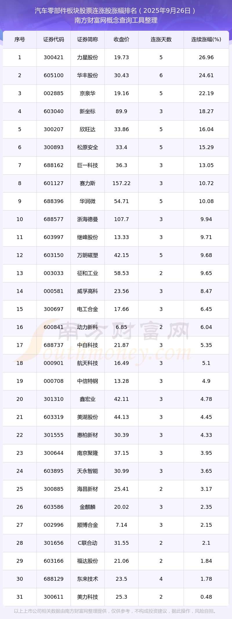 根據(jù)南方財富網(wǎng)概念查詢工具數(shù)據(jù)統(tǒng)計,截止2025年9月26日收盤,汽車零部件板塊股票共有31只個股實現(xiàn)連漲。其中連續(xù)漲幅較大的個股有力星股份、華豐股份、京泉華等,連續(xù)漲幅分別為26.96%、24.61%、22.19%。
