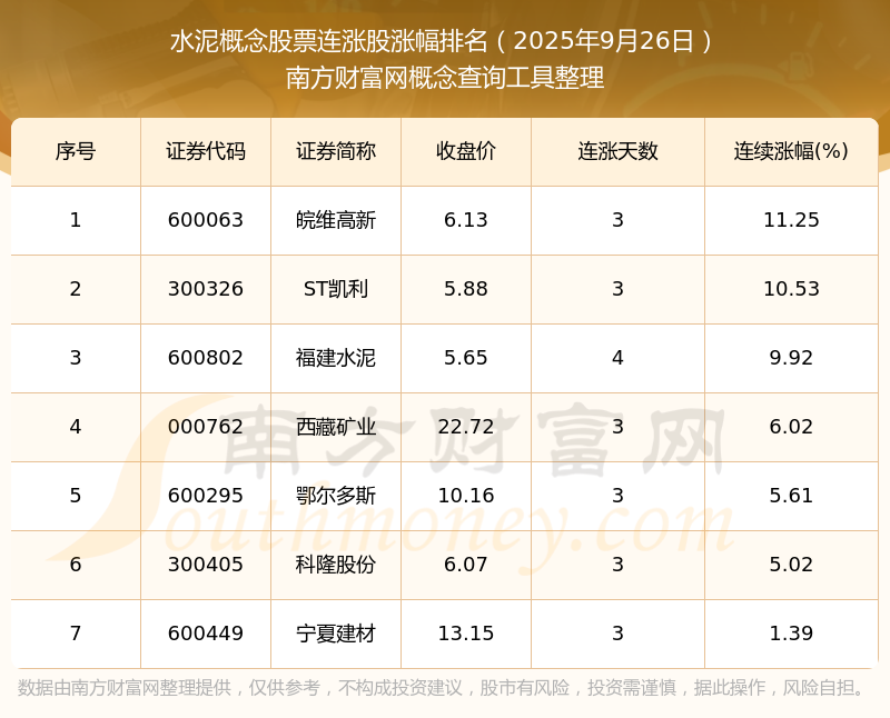 根據(jù)南方財富網(wǎng)概念查詢工具數(shù)據(jù)統(tǒng)計,截止2025年9月26日收盤,水泥概念股票共有7只個股實現(xiàn)連漲。其中連續(xù)漲幅較大的個股有皖維高新、ST凱利、福建水泥等,連續(xù)漲幅分別為11.25%、10.53%、9.92%。