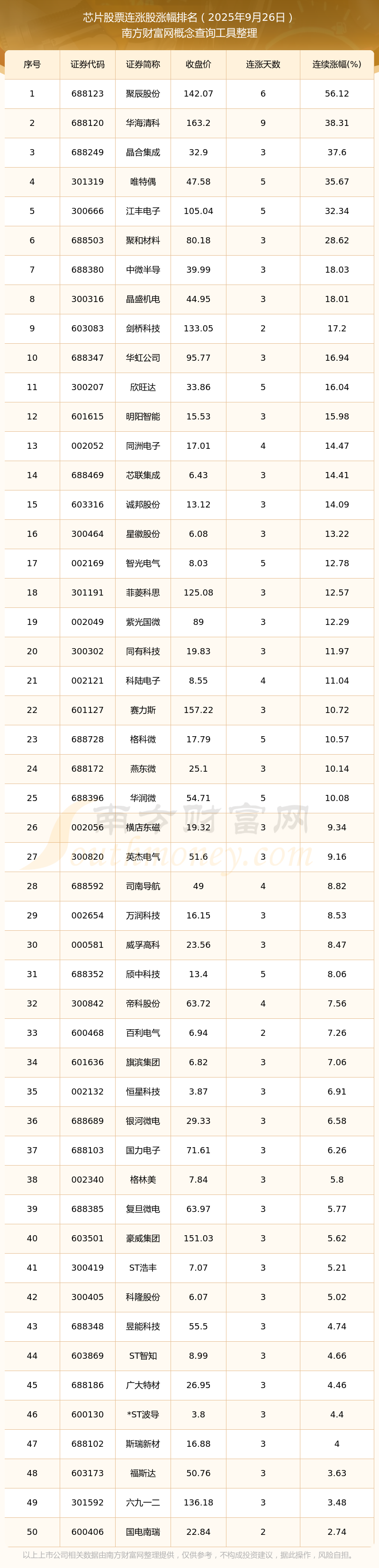 根據(jù)南方財富網(wǎng)概念查詢工具數(shù)據(jù)統(tǒng)計,截止2025年9月26日收盤,芯片股票共有54只個股實現(xiàn)連漲。其中連續(xù)漲幅較大的個股有聚辰股份、華海清科、晶合集成等,連續(xù)漲幅分別為56.12%、38.31%、37.60%。