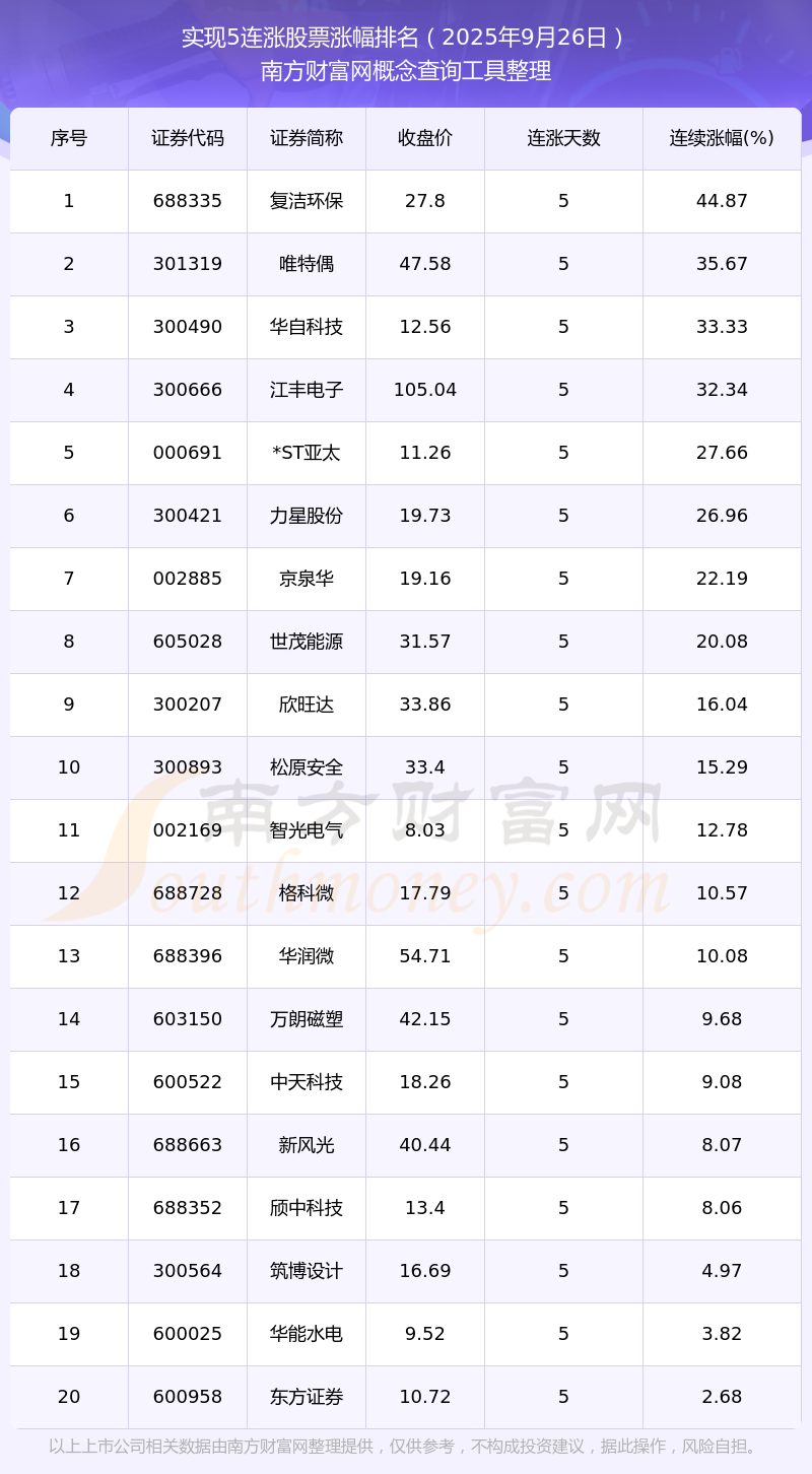 根據(jù)南方財富網(wǎng)概念查詢工具數(shù)據(jù)統(tǒng)計,截止2025年9月26日收盤,共有20只個股實現(xiàn)5天連漲。其中連續(xù)漲幅較大的個股有復潔環(huán)保、唯特偶、華自科技等,連續(xù)漲幅分別為44.87%、35.67%、33.33%。