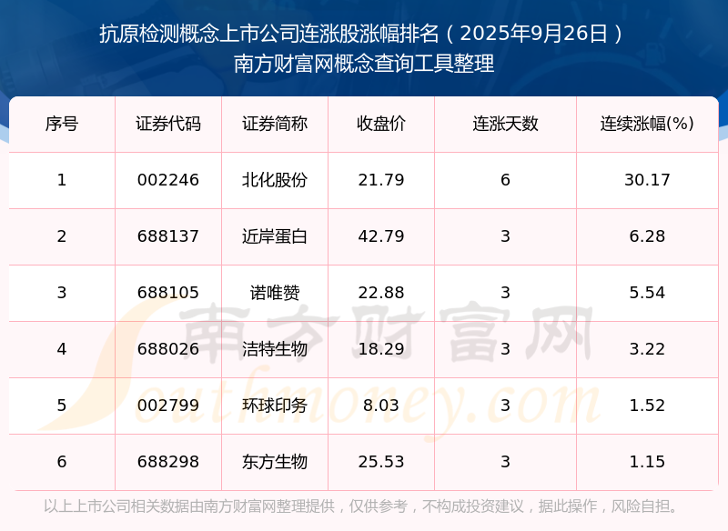 根據(jù)南方財(cái)富網(wǎng)概念查詢工具數(shù)據(jù)統(tǒng)計(jì),截止2025年9月26日收盤,抗原檢測(cè)概念上市公司共有6只個(gè)股實(shí)現(xiàn)連漲。其中連續(xù)漲幅較大的個(gè)股有北化股份、近岸蛋白、諾唯贊等,連續(xù)漲幅分別為30.17%、6.28%、5.54%。