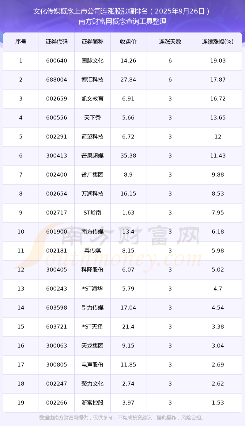2025年9月26日文化傳媒概念上市公司連漲股漲幅排名