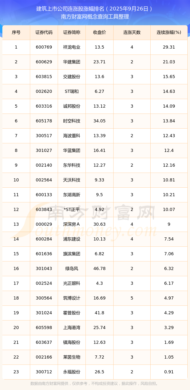 2025年9月26日建筑上市公司連漲股漲幅排名