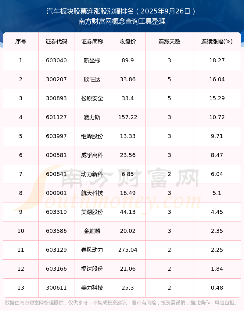 根據(jù)南方財(cái)富網(wǎng)概念查詢工具數(shù)據(jù)統(tǒng)計(jì),截止2025年9月26日收盤,汽車板塊股票共有13只個(gè)股實(shí)現(xiàn)連漲。其中連續(xù)漲幅較大的個(gè)股有新坐標(biāo)、欣旺達(dá)、松原安全等,連續(xù)漲幅分別為18.27%、16.04%、15.29%。