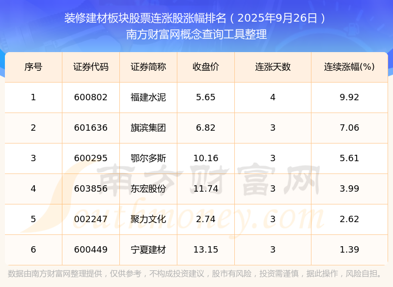 根據(jù)南方財(cái)富網(wǎng)概念查詢工具數(shù)據(jù)統(tǒng)計(jì),截止2025年9月26日收盤,裝修建材板塊股票共有6只個(gè)股實(shí)現(xiàn)連漲。其中連續(xù)漲幅較大的個(gè)股有福建水泥、旗濱集團(tuán)、鄂爾多斯等,連續(xù)漲幅分別為9.92%、7.06%、5.61%。