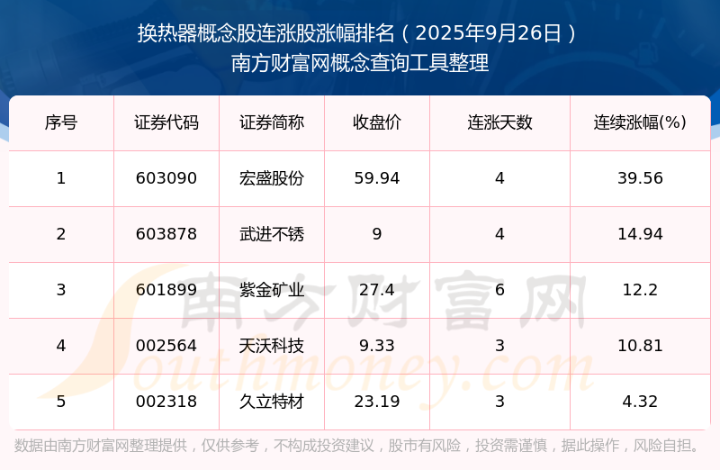 根據(jù)南方財(cái)富網(wǎng)概念查詢工具數(shù)據(jù)統(tǒng)計(jì),截止2025年9月26日收盤,換熱器概念股共有5只個(gè)股實(shí)現(xiàn)連漲。其中連續(xù)漲幅較大的個(gè)股有宏盛股份、武進(jìn)不銹、紫金礦業(yè)等,連續(xù)漲幅分別為39.56%、14.94%、12.20%。