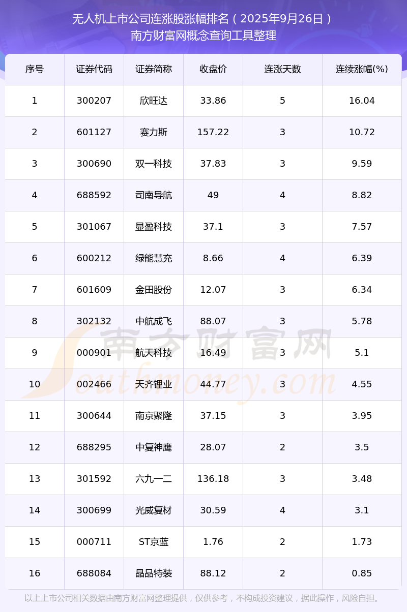 根據(jù)南方財(cái)富網(wǎng)概念查詢工具數(shù)據(jù)統(tǒng)計(jì),截止2025年9月26日收盤,無(wú)人機(jī)上市公司共有16只個(gè)股實(shí)現(xiàn)連漲。其中連續(xù)漲幅較大的個(gè)股有欣旺達(dá)、賽力斯、雙一科技等,連續(xù)漲幅分別為16.04%、10.72%、9.59%。