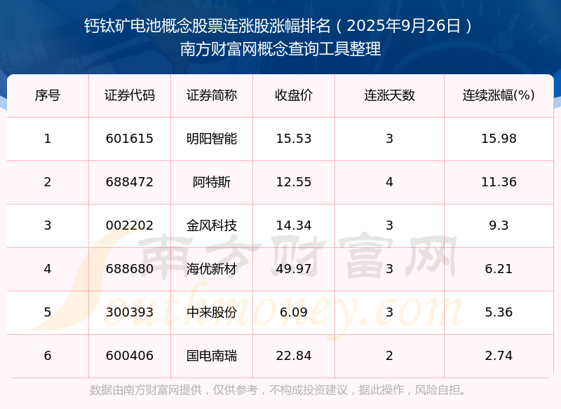 根據(jù)南方財富網(wǎng)概念查詢工具數(shù)據(jù)統(tǒng)計,截止2025年9月26日收盤,鈣鈦礦電池概念股票共有6只個股實現(xiàn)連漲。其中連續(xù)漲幅較大的個股有明陽智能、阿特斯、金風科技等,連續(xù)漲幅分別為15.98%、11.36%、9.30%。