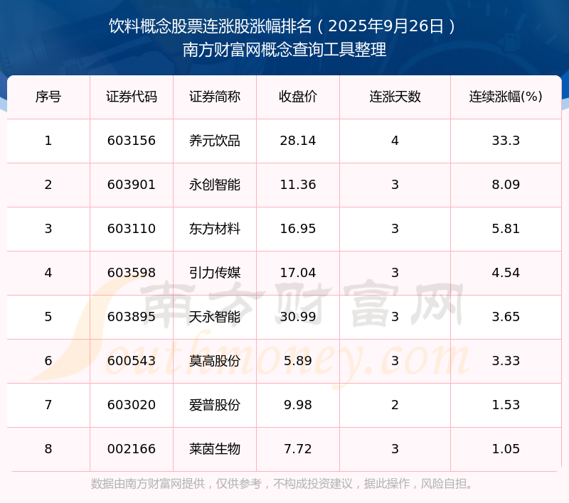 2025年9月26日飲料概念股票連漲股漲幅排名