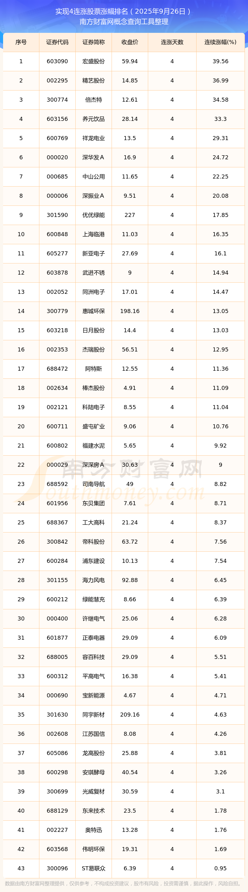 2025年9月26日實現(xiàn)4連漲股票漲幅排名