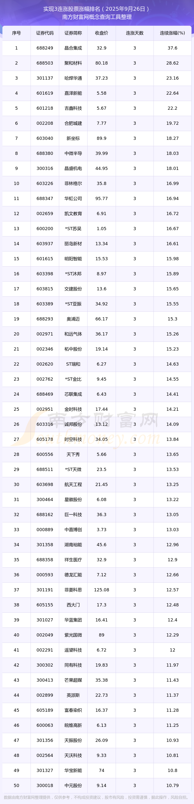 2025年9月26日實現(xiàn)3連漲股票漲幅排名