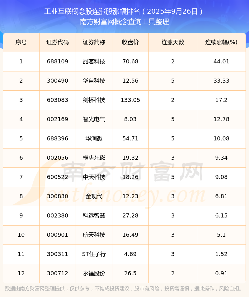 2025年9月26日工業(yè)互聯(lián)概念股連漲股漲幅排名