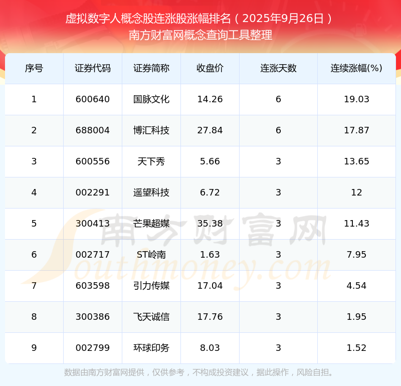 2025年9月26日虛擬數(shù)字人概念股連漲股漲幅排名
