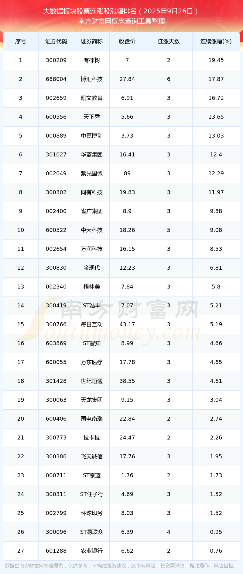 2025年9月26日大數(shù)據(jù)板塊股票連漲股漲幅排名