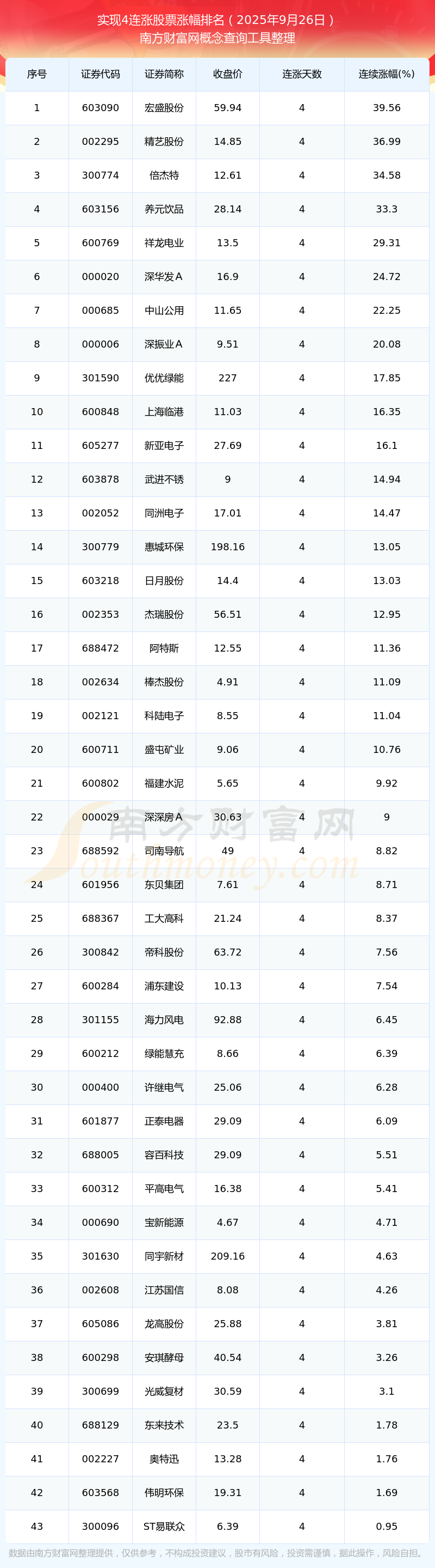 2025年9月26日實(shí)現(xiàn)4連漲股票漲幅排名