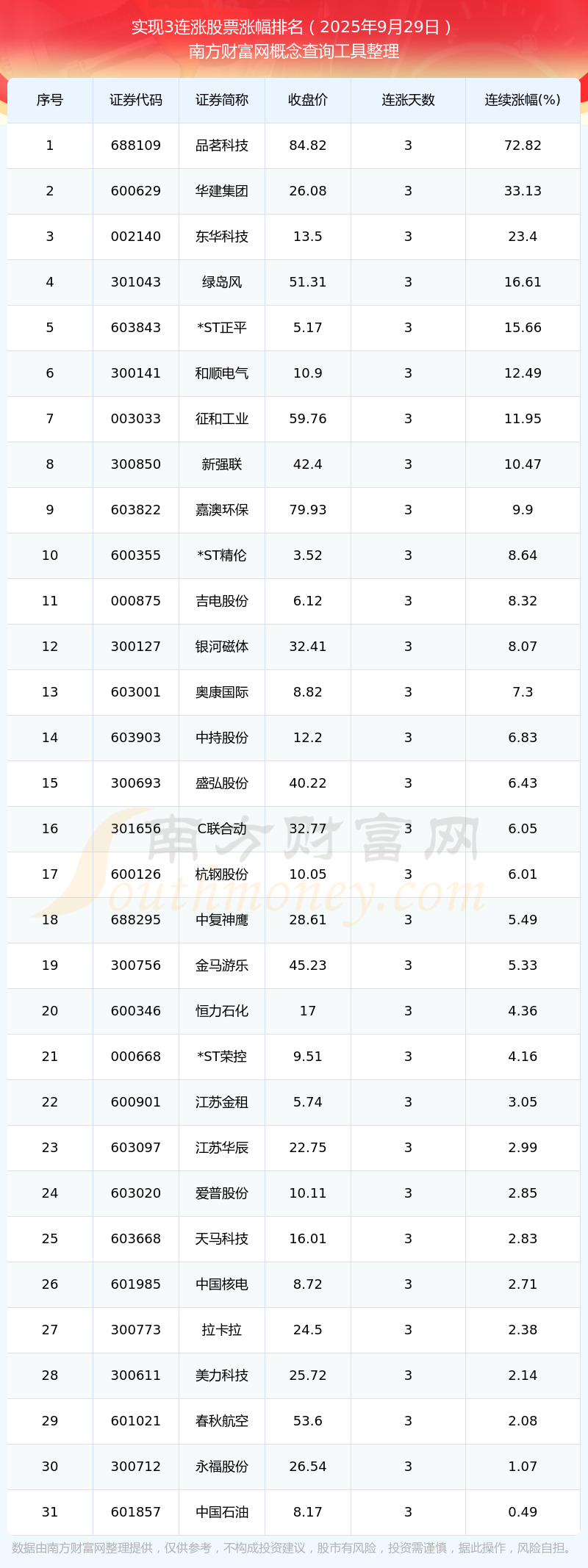 2025年9月29日實(shí)現(xiàn)3連漲股票漲幅排名