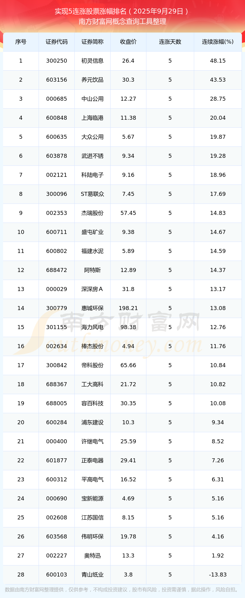2025年9月29日實(shí)現(xiàn)5連漲股票漲幅排名