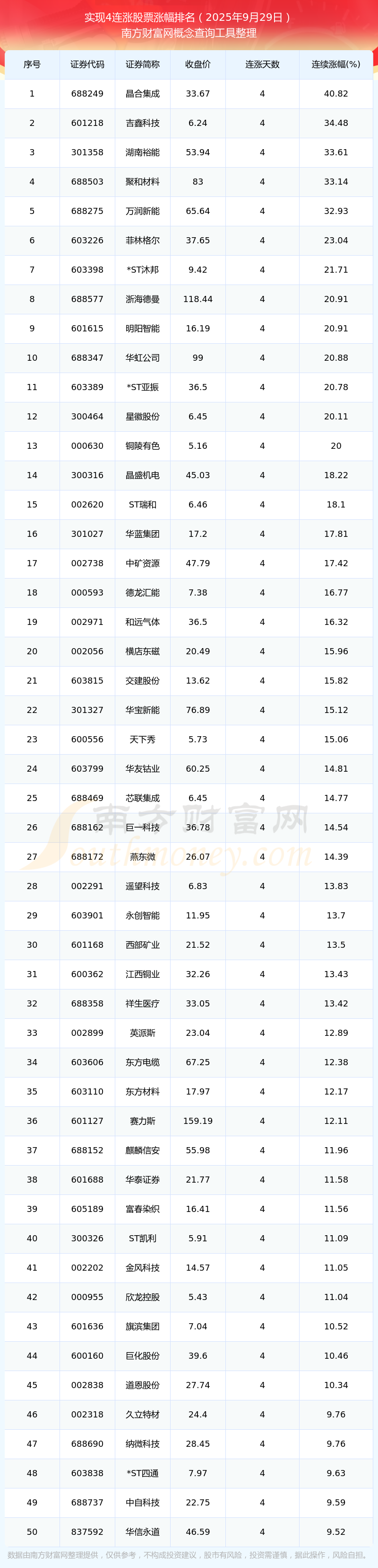 2025年9月29日實現(xiàn)4連漲股票漲幅排名