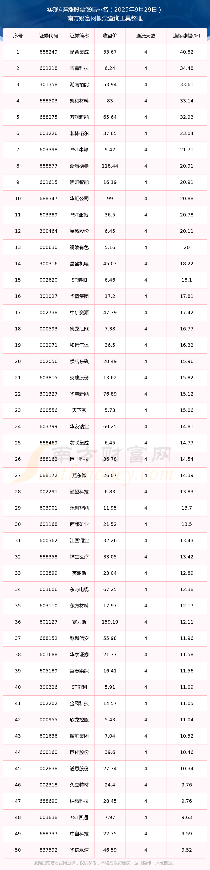2025年9月29日實現(xiàn)4連漲股票漲幅排名