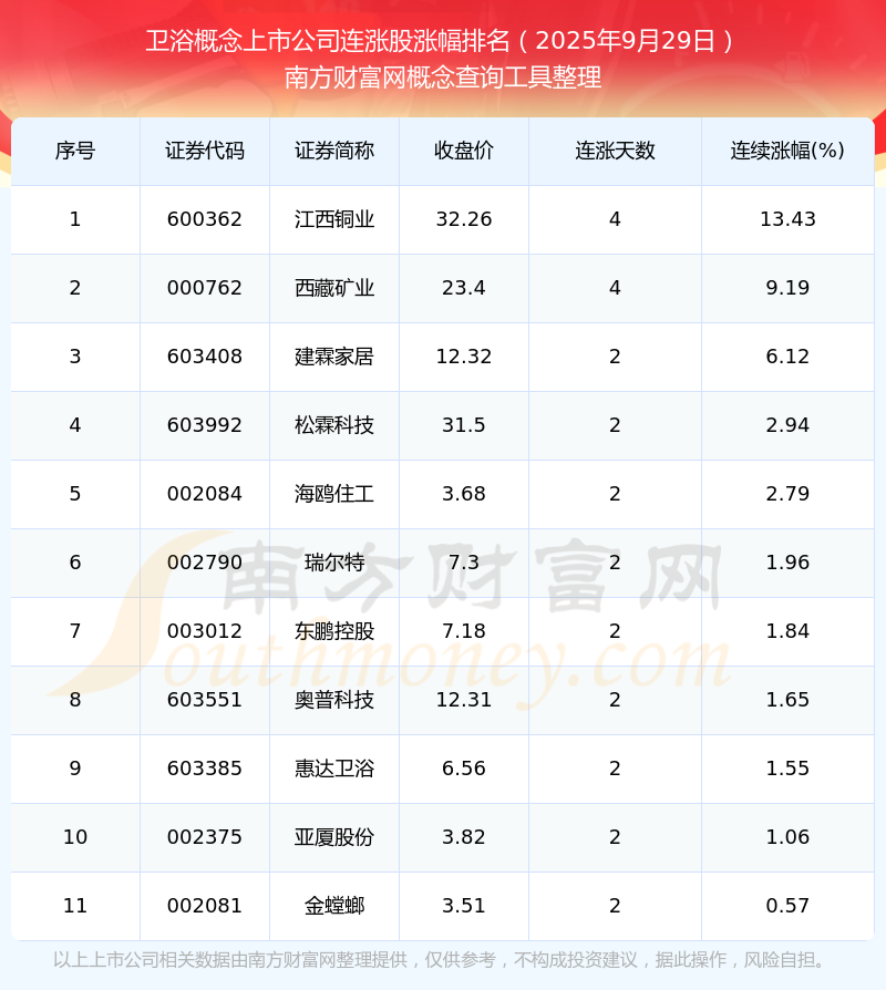 2025年9月29日衛(wèi)浴概念上市公司連漲股漲幅排名